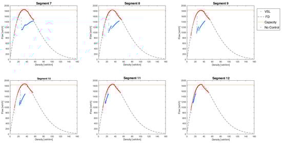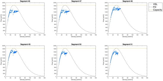 The benefits of adopting VSLs were fully achieved at the intersection, but the effects also needed to be evaluated within and upstream of the control sections. With particular reference to the last three kilometers subject to the strategy (from section 46 to 51), traffic evolution was observed with flow-density diagrams (Figure 10, where the simulated states are shown in blue in the dotted line in the fundamental diagram in the absence of speed limits).