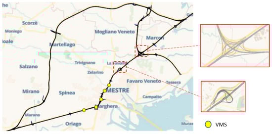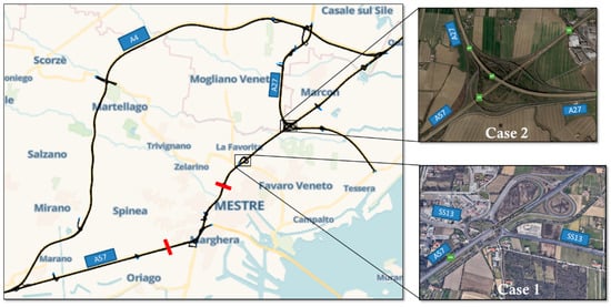 The case study concerned the A57 Highway, which acts as an interconnection between the city of Venice and the A4 (east and west) and A27 (north) highways (Figure 5).