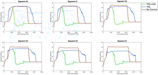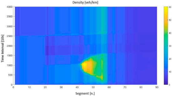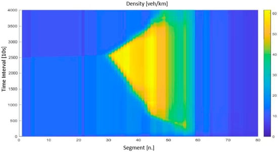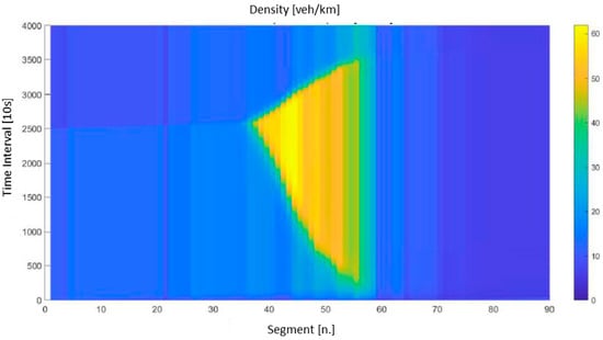 The scenario with no-control strategies application was not calibrated; we applied the parameters reported in the literature []. Figure 7 shows the density trend in space and time along the A57corridor. As can be seen, in the first hour of the simulation and thus until an equilibrium state was reached, the area adjacent to the Mestre location (between segments 44 and 59) was characterized by flows close to capacity, identifiable by the near-critical density values. As a result of the increase in demand at the intersection (segment 55), a kinematic wave was generated that, with different speeds depending on the variation in demand values, propagated upstream. At simulation interval 2500, the halving of demand on the main current was simulated. This phenomenon originated a congestion dissipation wave that started from the first section and, when it met the congestion wave near section 38, reduced its propagation speed by improving the performance of the vehicular current until the initial conditions were restored. The diagram thus shows how the congestion state propagated uncontrolled upstream for nine kilometers, remaining at the intersection until the arrival of the dissipation wave from upstream.