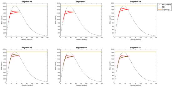 Figure 8 shows, from section 46 to section 51, the trend of traffic states, evaluating the simulated flow values as a function of the corresponding densities. The simulated states are shown in red while the fundamental diagram of the sections is shown with the dotted line. The capacity of the infrastructure is shown in orange, highlighting how in each segment it is much higher than the maximum flow. This is the capacity drop phenomenon whereby the infrastructure failed to utilize the entire remaining capacity in the transition from stable to congested conditions.