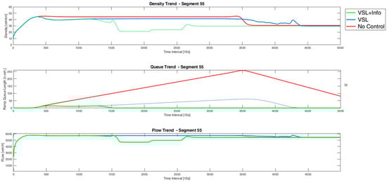 To further investigate the traffic behavior in section 55, the evolution of density, ramp queuing and flow values are shown in Figure 12, where simulated values using VSLs and user information are shown in light blue, outputs of the VSL strategy are shown in yellow, and results obtained in the absence of control strategies are shown in red.