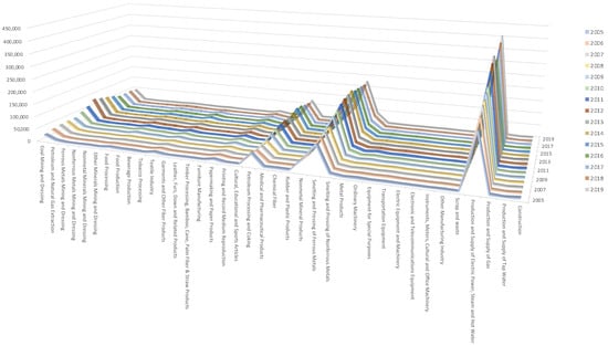 Figure 2 displays the carbon emissions of each industrial subindustry from 2005 to 2019 in China. Based on each industry’s annual carbon emissions (), we employed the backward first difference method, taking into account the index’s positive factor. As shown in Equation (3), we used the difference between the carbon emissions of industry in the current year and the previous year to calculate the carbon emission reduction () in industry in the current year, represented as a first differential label.