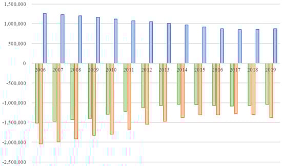 Within a complex system, the potential impact of carbon emission cutting and asset expansion on industrial costs is uncertain. We referred to particular academics [55,56] and utilized the prime costs of each industry for two consecutive years rather than the industry’s total costs (). Data come from the China Industrial Statistics Yearbook (2005–2019). In China, the prime costs indicate the cost related to the central business. Thus, we narrow the scope of the impact analysis by excluding the costs for activities unrelated to their primary activity. Next, by using the backward first difference approach to compute the current year’s cost reduction for each industry, as seen in Equation (4), we determined the current year’s cost savings () for each industry, while taking the cost indicator’s positivity into account.