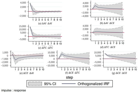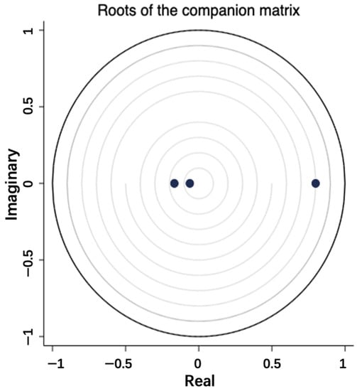 We calculated the eigenvalues of the PVAR unit root to determine the model’s stability. In Figure 4, the black dot represents the eigenvalues of , and . It can be observed that all eigenvalues are within the unit circle, demonstrating that the model’s long-term evolution is stable.