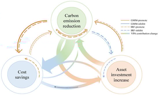 Figure 6 depicts an integration of the resulting relationships for all models, demonstrating the dynamic interaction mechanism of carbon emission reduction, cost savings, and asset investment. In the diagram, the orange line represents the facilitative effect, the blue line indicates the inhibitory effect, and the line’s thickness symbolizes the degree of influence. Additionally, the types of lines illustrate the various methodologies. The solid line denotes the GMM model, the long-dashed line means impulse response, and the streamlined type signifies variance decomposition analysis results.