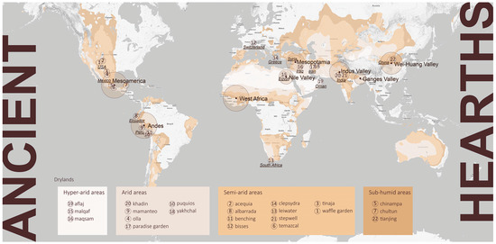 Geographically, research focused on traditional systems from across four zones of the aridity–humidity spectrum based on the Aridity Index (AI, calculated as the average annual precipitation divided by potential evapotranspiration): hyper-arid (AI < 0.05), arid (0.05 ≤ AI < 0.2), semi-arid (0.2 ≤ AI < 0.5), and sub-humid areas (0.5 ≤ AI < 0.65) [34,35]. Hence, a dry climate is measured by the water availability. Regions with greater AI are at greater risk of suffering from water scarcity and are more susceptible to desertification. Notably, by including the sub-humid tropical regions, characterized by seasonal monsoons [36], we set the boundaries of design research to incorporate extreme variability: drought punctuated by severe flooding.