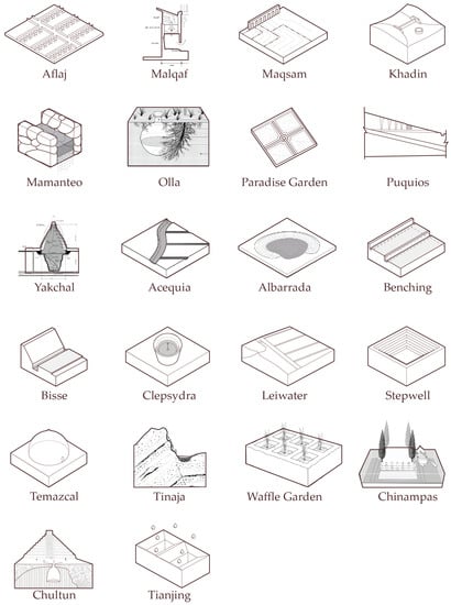 As an analytical aid, this study used taxonomy, a classification practice borrowed from biology [44], to isolate and categorize specific spatial and social characteristics. As demonstrated in Table 1, the water systems share common physical characteristics (‘hardware’). Among systems, striking alignments of form emerged across diverse geographies, cultures, and eras. The aflaj, puquio, acequia, bisse, and leiwater are all linear systems, visible channels that serve as spines or armatures, organizing adjacent bands of perpendicular parcels. Khadin, mamanteo, pardis (paradise garden), albarrada, benching, waffle gardens, and chinampas were categorized as ‘fields’, or planes of manipulated land surfaces, some forming bounded space by their enclosing perimeter, others forming open-sided territories characterized by aggregated interventions (extended patterns of terracing, grading, berming, for example). Chultuns, tinajas, ollas were categorized as free-standing—sometimes visible, sometimes hidden—‘vessels’ for the storage of water. Malquaf, stepwells, and tianjing were seen as ‘buildings’, architectural-scale urban constructs for water capture, storage, and distribution. Yakchal, clepsydra, and maqsam were seen as ‘devices’ or tools—landmark, clock, calendar at the scale of the human body—that performed measuring or partitioning functions within larger systems.