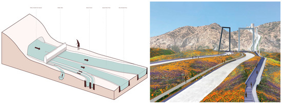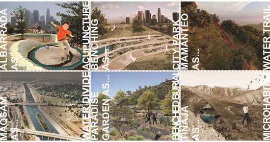Design researchers modified other systems’ function, form, and/or scale to serve new social, ecological, or spatial purposes in Los Angeles (see Figure 8). Albarrada, originally a system for retention and infiltration of runoff in agricultural settings, was repurposed as urban multipurpose green infrastructure, designed to retain, store, soak, and filter runoff and also support play, performance, and gardening. Similarly, benching was proposed as a stormwater-infiltration infrastructure to protect urban ecosystems by slowing and infiltrating runoff, preventing erosion, and providing space for community gatherings, memorials, and hiking trails. Mamanteo was designed as a gravity-fed means to convey water from the wet side of a coastal range to the dry side. It distributes water, limits run-off, captures surface flows, increases water infiltration through its clay bottom, and enhances animal habitats. Figure 8 demonstrates a scenario in Griffith Park where a mamanteo supplies overflow to a public park, serving also as a sloped path and as land art. The systems were conceived as an assemblage: a network of many small-scale, distributed interventions improving the function of the city’s water basin over time.