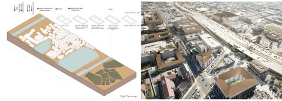 Illustrative diagrams (e.g., Figure 12) can support community outreach and stakeholder engagement by providing a common language for discussions between specialists and the public about architectural design, environmental engineering, urban planning, and other related topics. Analogous perhaps to Map of Ancient Courses of the Mississippi River Meander Belt, as analyzed by Nordenson et al. (2018), landscape representations are important, not only because they capture constant temporal, social, and infrastructural changes, but also because they depict those processes using a creative and engaging visual language [47]. In Nordensen et al., drawings highlight how water strategies traverse scientific and artistic perspectives, showcasing the landscape’s complex and dynamic processes with humans. Similarly, this research can be seen as an interface for a variety of fields that play roles in urban resilience, facilitating widespread access to and adoption of diverse, once-obscured approaches to long-term environmental and cultural sustainability.
