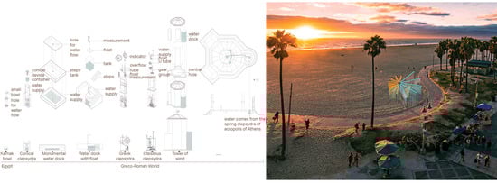 A body-scaled system, the clepsydra, is the oldest time measurement device from the Greco-Roman world [41], a water clock [42]. Unlike a sundial, it can be used at night and on cloudy and rainy days. In a modern, data-driven interpretation, a research member proposed clepsydras as public art stations, revealing changes in rainfall across seasons and time (Figure 7). In the future, making water data prominent in a network of everyday urban spaces could increase urban dwellers’ ability to recognize and anticipate water limits and self-regulate in response.