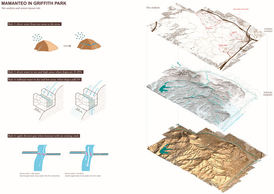 Furthermore, design researchers were required to articulate specific criteria and parameters for modifying traditional systems to deliver value within new physical or cultural settings. In Figure 9 the designer set specific criteria for the mamanteo and developed four rules for water delivery and infiltration: (1) direct water from wet zones to dry zones; (2) divert water from wet and high areas when slopes are more than 20%; (3) infiltrate water into dry and low areas when slopes are less than 2%; and (4) apply diverter gates when the mamanteo intersects with an existing creek. Figure 9 shows site-specific conditions for applying the system, including topography, hydrology, land use, and circulation, to deliver supplies to dry areas (in this case, the cemetery, public park, and zoo).