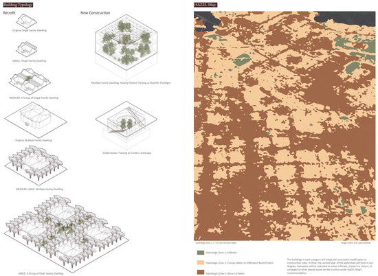 Figure 10 provides another example of how the criteria are applied to the modernized tianjing. Initially, the design research member utilized HazelDry, a robust GIS-based computer modeling platform for water-wise planning to facilitate integrated and holistic water strategies [43]. By providing accurate information on hydrologic functions, HazelDRY allows the design researcher to assess infrastructure, building projects, and the ecosystems that support stormwater management. This platform can substantially decouple the water–energy nexus by optimizing the hydrologic function of the built environment, which in turn promotes a fine-scaled dispersed water infrastructure that honors the cultural and biophysical characteristics of neighborhoods and watersheds. As shown in Figure 10, the test site—the San Fernando Valley—is categorized into hydrological zones: 1 (infiltration), 2 (capture and conveyance), and 3 (storage) with design interventions for stormwater management proposed accordingly, some as retrofits and others as new construction. For existing residential projects, according to building size, an attached flipped awning system or a free-standing funnel system is developed individually or collectively for the buildings, while for new construction, the stormwater management function is integrated into the building form.