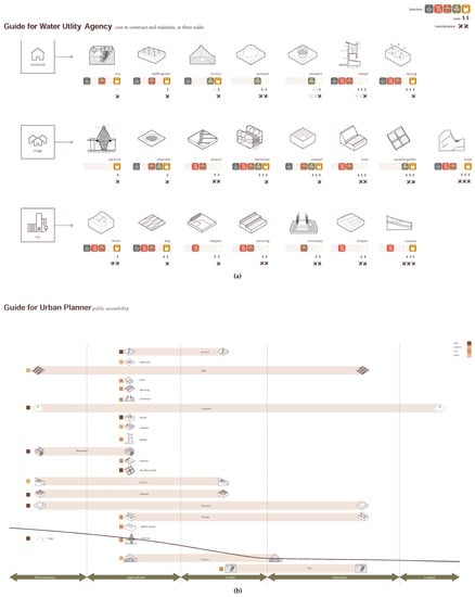 Illustrative diagrams of water system suitability for various audiences: (a) guide for a water utility agency regarding the function, cost, and construction difficulty; (b) guide for an urban planner concerning the landform and suitable urban climate types. Image Source: Advanced Design Studio, USC School of Architecture.