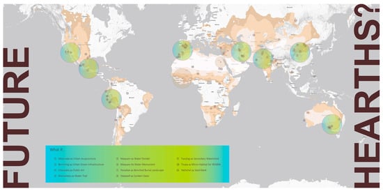 The research expands the range of possible responses available for dealing with the effects of climate change. At the end of this research phase, the compiled atlas and design research reached 360 pages, both in an interactive Portable Document Format (pdf) and as a physical book [38]. Its purpose is to expand literacy in traditional systems and their underlying principles, inspiring carbon-free systems and collaborative management practices, reinvigorating urban environments with networks of visible water management nodes designed to stimulate adaptive, open-ended change. Beyond LA, the research team speculated on other global cities where these traditional systems might provide cultural and functional value. We see these as “future hearths” (Figure 13).