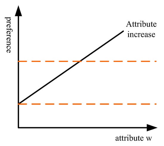 The utility maximization hypothesis and stochastic utility theory serve as the theoretical basis for discrete choice models. The utility function is the key to solving the problem with a discrete choice model, which is used to describe the utility of each attribute at different levels []. Figure 3 shows the utility function model figure.