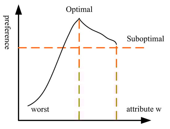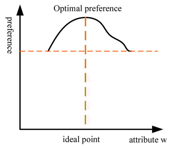 In the ideal point model, an ideal model needs to be determined between parameter selection and weight distance, and its ideal attribute level constitutes the peak point of the curve, as shown in Figure 2, which is an ideal point model figure.