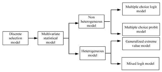 The discrete choice model is a very effective and practical market research technique. The model allows consumers to choose any product without buying it, which can more realistically simulate the process of consumers purchasing products []. Taking the consumption of environmental protection commodities as the empirical research object, the discrete choice model is used to analyze the consumption preferences of consumers when purchasing environmental protection commodities from the perspective of consumers and determine the main factors that affect consumers’ purchase of environmental protection commodities. Discrete selection models can be divided into three categories based on different types of sample data: discrete-choice models for cross-sectional data, discrete-choice models for non-stationary time-series data, and discrete-choice models for panel data.