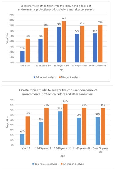 Due to significant differences in consumer preferences for environmentally friendly products among different age groups, this article is based on two consumption models to assist consumers in making consumption decisions and compares the changes in consumers’ desire for environmentally friendly products before and after the application of the consumption model, as shown in Figure 5.