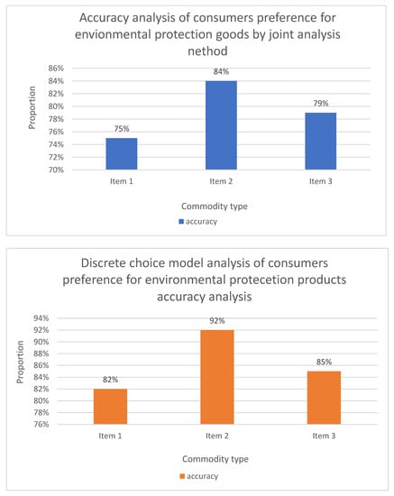 By analyzing the accuracy of residents’ consumption preferences for the three environmental protection commodities under the conjoint analysis method and the discrete choice model, it is found that in the discrete choice model, the residents have higher accuracy for the environmental protection commodities. It can be seen from the figure that for commodity 1, commodity 2, and commodity 3, the accuracy of the discrete selection model is 82%, 92%, and 85%, and the prediction accuracy is higher than that of the joint analysis method by 7%, 8%, and 6% respectively. It can be seen that the prediction accuracy of the discrete choice model is higher than that of the conjoint analysis method, and the discrete choice model is more suitable for analyzing consumer preferences.