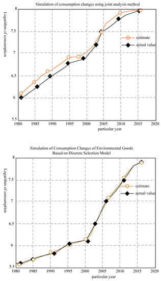 As shown in Figure 7, the joint analysis method differs significantly from the simulated and actual values of the discrete choice model in analyzing the changes in consumer consumption of environmentally friendly goods. During the simulation process using the joint analysis method, it was found that only in 2005, when the logarithm of consumption was 7.5, and in 2015, when the logarithm of consumption was close to 8, the simulated values and actual values were similar. Under other conditions, the error between the simulated values and the actual values was relatively large; Under the same conditions, the simulated values of the discrete choice model for commodity consumption are basically similar to the actual values, with small error values. Therefore, under the same conditions, choosing a discrete selection model to simulate the consumption of environmentally friendly goods is more accurate, with significant changes in consumer purchases and smaller errors.