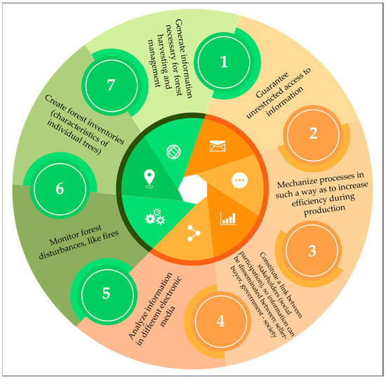 At this moment, there is constant growth and improvement in the implementation of ICTs and communication flows in the forestry sector [34]. There is a growing number of digital tools being developed to improve the management of forest resources and promote communication among the various actors involved [63], such as forest owners, forestry companies, government agencies, and researchers [64]. Therefore, the use of these technologies provides important improvements in forest management such as (i) the improved control of operations, (ii) automation of operations throughout the chain, (iii) improved decision-making based on data and information, (iv) combination of data on tree growth, (v) identification of timber potential, and (vi) identification of environmental conditions to plan future growth models [36,65].