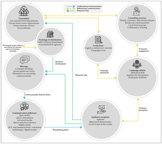 If the communication flow is linear, the elements of this process are sender, message, medium, receiver or audience, and effect [94]. Communication can be one-way when the message is delivered directly from the sender to the receiver and is considered two-way when there is interaction between the parties [91]. In the forestry area, both communication flows coexist (Figure 3); each of them integrates different mechanisms (communication channels and form of persuasion), time (short- or long-term), target audience (forest owners, general public, etc.), and message [95]. It is important to mention that if there is effective communication, it is possible to articulate and propose strategies for forest management and establish public policies focused on environmental protection and sustainable management and integrate all stakeholders’ points of view into decision-making [62]. Therefore, communication flows contribute to the sustainable management of forest resources with the participation of stakeholders in forest management.