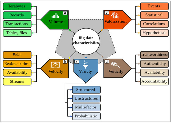 Big data refers to large data sets whose size exceeds the capacity of typical database software [118,119]. For a better understanding, these characteristics are represented in Figure 4.