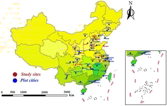 China is located in the east of Asia and on the west coast of the Pacific Ocean, with a total land area of approximately 9.6 million square kilometers. It spans a wide latitude range, and the terrain is diverse, with various terrain types and mountain orientations. Therefore, the combination of temperature and precipitation is greatly different, resulting in a variety of climates throughout the country. The seasonal distribution of rainfall in China follows a pattern of decreasing amounts from the coastal areas of the southeast to the interior of the northwest. The geographical location across three climate belts makes China’s water resources highly unequally distributed. Currently, the Chinese government has established 33 sponge city pilot cities (blue in Figure 1), with construction sites mainly distributed in central and eastern China. Fewer construction sites are located in the northeast and west. Based on the completion level and construction time of the sponge city construction, and the degree of completeness of published data, 11 cities were collected with detailed research data on biological retention ponds as research areas (red in Figure 1).