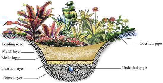 In the various measures of the sponge city system, the purification effect of bioretention ponds has received widespread recognition and application [4]. Bioretention ponds are small-scale natural treatment systems that use porous filter media for growing one or more vegetation species to filter pollutants in rainwater [5]. The aim is to overcome the negative impact of urbanization on water quality by simulating the natural water cycle in urban planning and design, which helps the system return to its natural hydrological condition before development. This delay of peak flow and reduction of peak flow total volume can prevent sewage overflow. Additionally, it can remove total suspended solids, nitrogen, phosphorus, heavy metals, and carbon-based pollutants [6]. Current research on bioretention ponds mainly focuses on three aspects: types of filler, species of plants, and the design size of the bioretention area. Robert [7] et al. tested the accumulation, distribution, and concentration of 38 organic pollutants in 12 bioretention facilities and found that the concentration of pollutants in the upper media layer was higher, and it decreased as the surface depth increased. Öhrn Sagrelius [8] studied the impact of different construction designs and building components on different bioretention systems and summarized the function of hydrological cycling in plants and microbes in bioretention systems. Mehmood [9] summarized the functions of plant and microbial studies in the hydrological cycle of biological retention systems and proposed to characterize rainwater and allocate water sources in different regions according to socio-economic, topographic, and climatic conditions.