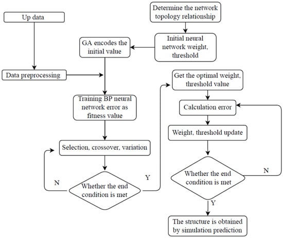 GA is an optimization algorithm based on the theory of natural selection and genetic mechanism. It simulates the process of biological evolution to generate the solutions of the problem through operations such as replication, crossover, and mutation. It gradually eliminates the solutions with low fitness function values and increases the solutions with high fitness function values. After evolving for N generations, it is possible to evolve individuals with high fitness function values, which are the optimal solutions of the target function values we want. BP neural networks have strong local search abilities but are easy to get stuck in local minima. GA has the characteristics of self-adaptability, global optimization, and implicit parallelism, so both GA and BP neural networks can be perfectly combined to achieve automatic optimization and improve learning efficiency. The specific optimization flow chart is shown in Figure 3.