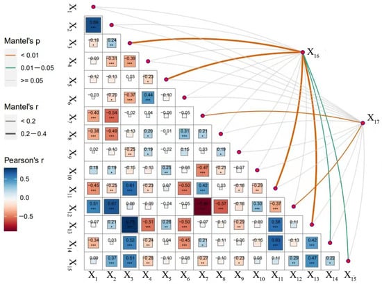 Using the R language software, Mantel test analysis results were conducted, as shown in Figure 4, to determine the statistical differences between each indicator and their correlation coefficients. The color gradient represents the correlation coefficient, while * and ** indicate significant correlations at p < 0.05 and p < 0.01, *** indicate significant correlations at p < 0.001, respectively. The width of the lines corresponds to the Mantel R statistical parameter, while the color of the lines corresponds to the statistical significance based on connectivity.