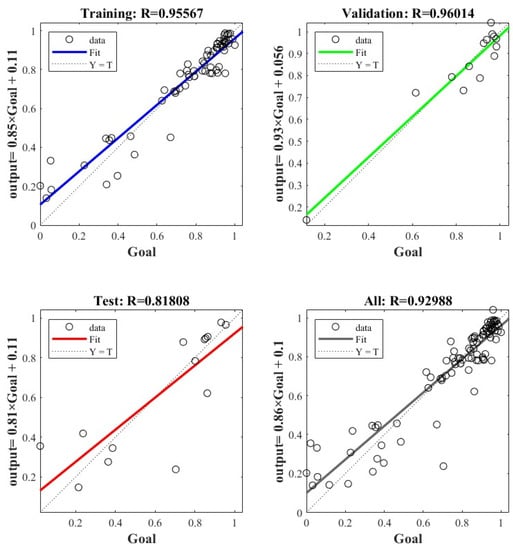 Firstly, the randperm ( ) function was used to randomly shuffle the sample data and repeat the parallel modeling 5 times to better demonstrate the stability and reliability of the model prediction. Of the randomly shuffled data, 82% were used for model training and 18% were used for data testing. The data used for testing were not involved in model training. However, due to the differences in the units and scales of the input data, the mapminmax ( ) function was used to firstly normalized the data, and then, to perform inverse normalization, the mapminmax ( ) function was used after model training and testing. The genetic algorithm generations were set to 100, the population size was set to 20, and the training target was set to 0.000001.