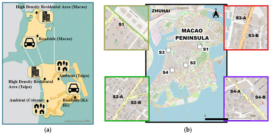 (a) Air quality monitoring network spatial location in Macao; (b) Different locations of conducted monitoring campaigns.