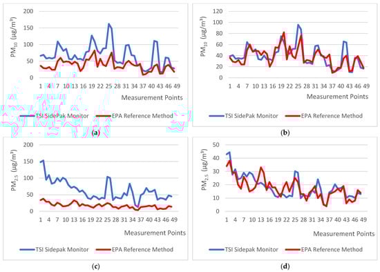 The calibration factor (CF) for PM10 and PM2.5 derived from this study is 0.59 and 0.29, respectively. Figure 5a,b show the PM10 measurement before and after QC/QA and calibration. Figure 5c,d show the PM2.5 measurement before and after QC/QA and calibration. As shown by Figure 5, there is a significant improvement in the accuracy of the measurement by the TSI Sidepak Monitor after calibration, which is very important for the result reported in this study (Figure 5a–d). Table 1 shows the performance indicator before and after the calibration. The RMSE and MAE after calibration have significantly improved, for PM10, they are 12.03 and 9.07, respectively, and for PM2.5, they are 5.76 and 4.47, respectively (see Table 1).