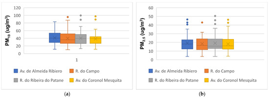 Figure 6a shows the boxplot of PM10 average distribution by traffic site, including the first quartile, average (represented by x), median (represented by -), third quartile, and outliers (represented by dots). For Av. do Coronol Mesquita, the average is 38.4 µg/m3 and the median is 39.2 µg/m3. For R. do Campo, the average is 39.8 µg/m3 and the median is 36.0 µg/m3. For R. do Ribeira do Patane, the average is 40.2 µg/m3 and the median is 39.8 µg/m3. For Av. de Almeida Ribeiro, the average is 40.8 µg/m3 and the median is 40.4 µg/m3. Overall, the average and median values for PM10 mean distribution are within a close range for all four locations (Figure 6a).