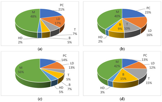 Traffic characterization by type of vehicle in (a) Av. do Coronol Mesquita, (b) R. do Campo, (c) R. da Riberia do Patane, and (d) Av. de Almeida Ribeiro over two sampling periods. (PC—passenger cars; LD—light-duty vehicles; T—taxis; B—buses; HD—heavy-duty vehicles; M—motorcycles).