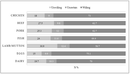Gender had no significant effect (p > 0.05) on consumers’ willingness to consume chicken, eggs, and dairy products. Nevertheless, it significantly affected (p < 0.05) their willingness to consume beef (U = 5680, p = 0.048), pork (U = 5576, p = 0.027), fish (U = 5550, p = 0.022), and lamb/mutton (U = 5342, p = 0.008), such that female consumers were significantly less willing to consume these products compared to the male consumers. In contrast, the age of the consumers had no significant effect (p > 0.05) on their willingness to consume beef, pork, fish, and lamb/mutton but had a significant effect (p < 0.05) on their willingness to consume chicken (H(4) = 10.555, p = 0.032), eggs (H(4) = 14.958, p = 0.005), and dairy products (H(4) = 15.739, p = 0.003). Those aged between 18 and 29 were significantly the most willing, while those in the 40 to 49 age range were significantly the most unwilling, to consume chicken, eggs, and dairy products.