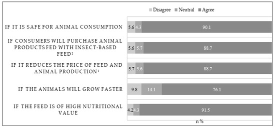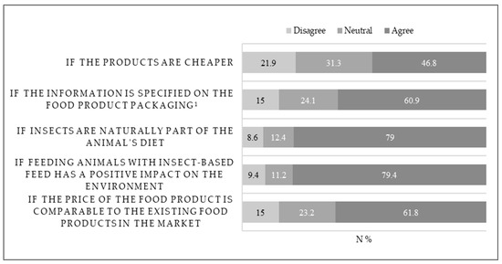 More than 75% of the participants agreed with the statements that they would be willing to consume food derived from animals fed IBF “if insects are naturally part of the animals’ diet” (79%) and “if feeding animals with insect-based feed has a positive impact on the environment” (79.4%). This was followed by those willing to consume such food products “if the price of the food products is comparable to the existing food products in the market” (61.8%) and “if the information is specified on the food product packaging” (60.9%). Almost half of the consumers (46.8%) agreed that they would be willing to consume foods from animals fed insect-based feed “if the food products are cheaper” (see Figure 2).