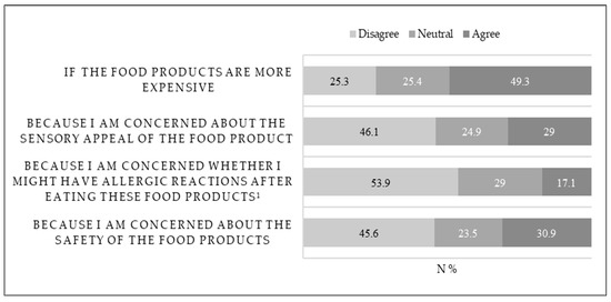 About half of the consumers disagreed with the provided statements that they would be unwilling to eat food products derived from animals fed with IBF “because I am concerned whether I might have allergic reactions after eating these food products” (53.9%), “because I am concerned about the sensory appeal (i.e., taste, aroma & texture) of the food product” (46.1%) and “because I am concerned about the safety of the food products” (45.6%). Almost half of them, nevertheless, agreed that they would be unwilling to consume “if the food products are more expensive” (49.3%). Nearly a third of the consumers could neither agree nor disagree with all these statements (see Figure 3).