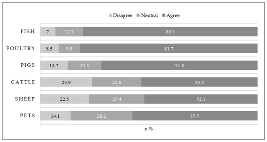 Most farmers agreed with the use of IBF for poultry (81.7%), fish (80.3%), and pigs (71.8%), as seen in Figure 4. Nearly 60% of the farmers agreed with the use of IBF for pets whilst slightly over half agreed with its use for cattle (53.5%) and sheep (52.1%). Regarding the use of IBF for cattle and sheep, the other half of the farmers was almost evenly divided between those who disagreed (23.9% and 22.5%, respectively) and those who were unsure (22.6% and 25.4%, respectively) (see Figure 4).