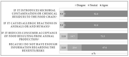 Almost all the farmers agreed that they would not be willing to use IBF for their animals “if it introduces microbial contamination or chemical residues to the food chain” (92.6%) and “if it causes allergic reactions in animals or/and humans” (92.6%). This was followed by those who agreed that they would not be willing to use IBF “if it reduces consumer acceptance of food resulting from animal production” (73.5%) or “because I do not have enough information regarding the benefits/risks” (67.6%). About a fifth (20.6%) of the farmers could neither agree nor disagree to the statement “because I do not have enough information regarding benefits/risks” as their reason for unwillingness to use IBF (see Figure 6). No significant correlations (p > 0.05) were observed between the farmers’ willingness to use insect-based feed and their level of agreement with any of these statements.