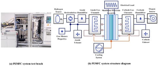 The data in this study are the actual measured data obtained with a PEMFC system test bench (RG220-3 kW, Dalian Rigor New Technology Co., LTD., Dalian, China), as shown in Figure 1a. The power range of the RG220 was 1.5~5 kW. The main purpose of the test bench was performance evaluation, activation, lifetime testing, and quality inspection of PEMFCs. The real-time monitoring interface of the PEMFC system test bench monitors the temperature, gas pressure, and gas flow of the PEMFC in real time. This experiment was conducted on a 3 kW PEMFC system test bench to feed hydrogen and air into the control system of the test bench to adjust the pressure, temperature, backpressure, stoichiometric ratio, flow rates of hydrogen and air, PEMFC temperature, and the real-time stack power obtained from the magnitude of the current. The test bench collected data every second. The operating parameters of the test bench were as follows: the relative humidity was 100%, the operating temperature was room temperature, the time interval of sampling was 1 s, and the stack power was 3 kW. Figure 1b shows the PEMFC test bench system structure. The PEMFC parameters are listed in Table 4.
