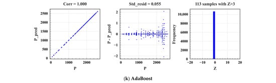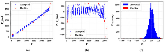 Figure 3 shows the Ridge model on the training set, in which “Outlier” indicates an abnormal value of power, and “Accepted” represents normal power. The parameter of the Ridge model was set to sigma = 3. Figure 3a is the scatterplot representing the actual power (P) and predicted power (P_pred). Figure 3b shows the residual of the actual power (P) versus the predicted and actual power (P-P_pred). Figure 3c presents the residuals of the predicted and actual power of the model and the frequency (vertical axis: Frequency) falling in the intervals on the Z axis (Z = (resid-mean_resid)/(std_resid). On the horizontal axis Z, resid represents the residual of the predicted power and actual power, mean_resid is the mean value of the residuals of the predicted power and actual power, and std_resid denotes the variance of the residuals of the predicted and actual power. Setting the Ridge model parameter sigma = 3 indicates that samples with absolute values of residuals of predicted and actual power exceeding 3 (absolute value of Z exceeding 3) are considered abnormal samples.