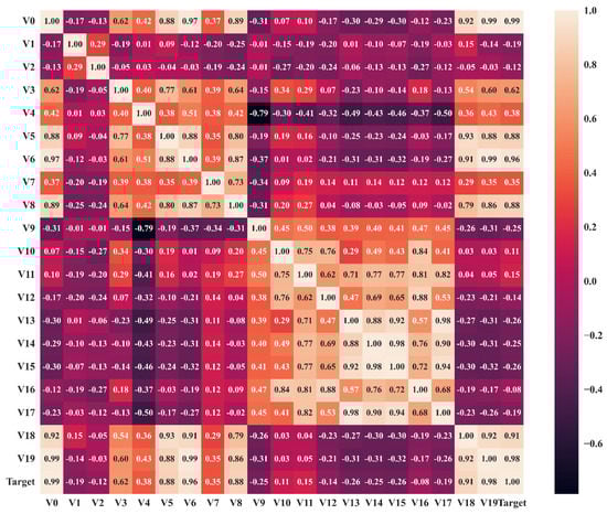 We investigated the impact of the 20 operating parameters in Table 5 on the target variable. If too many characteristic variables are input, the model will become complicated, and its performance will decrease. Therefore, the heat map method was adopted to analyze the correlations between characteristic variables V0–V19 and the correlations between these variables and the target variable. The characteristic variables that significantly impact the power of the PEMFC were screened out based on their correlation coefficients. It is observed in Figure 4 that the characteristic variables with a correlation coefficient greater than 0.3 with the target variable were V0, V3, V4, V5, V6, V8, V18, and V19. V8 indicates the cell temperature.