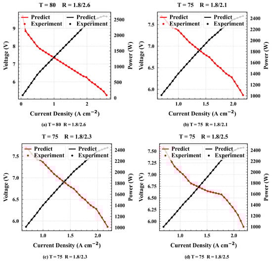 The main influencing factors of the PEMFC are categorized into two types: operating and physicochemical parameters. In this study, the physicochemical parameters were kept constant, as summarized in Table 4. Among them, the backpressure of oxygen is an important operating parameter, which, together with the oxygen flow rate, is related to the stack power density, voltage–current characteristic, and voltage [57]. Raising the backpressure facilitates a rise in the partial pressure of the reactant gases and the electrical potential of the PEMFC, which is conducive to improving the performance of the PEMFC. The cell temperature is another important operating parameter that significantly impacts PEMFC performance. As the temperature rises, the cell performance improves within a certain range. The ohmic resistance of the electrolyte drops as the temperature rises, resulting in a lower internal resistance of the cell and a higher mass transfer rate. However, the PEMFC’s working temperature is limited by the water vapor pressure in the proton exchange membrane. If the temperature is high, the dehydration of the membrane leads to compromised ion conductivity.