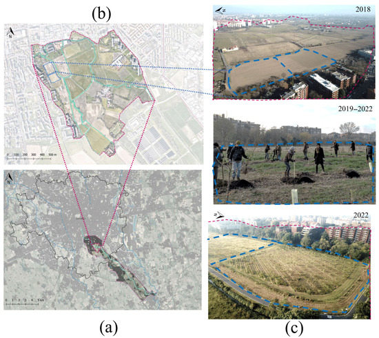 (a) The study area location (local scale boundaries, red dotted line) among the Milan south-eastern peri-urban belt, highlighting the extra-local scale boundaries (rose dotted line), corresponding to the Vettabbia Valley landscape system. (b) The study area: local scale boundaries (red dotted line) and field scale ongoing productive agroforestry (AF) projects (blue dotted line). (c) AF area changes between 2018 and 2022: from crop-field to a community-based agroforestry system.