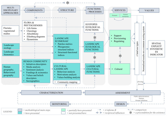 Figure 2 shows the analytical and interpretative methodology we set up. It was directly inspired and readapted from Babì Almenar’s work [83]. We kept a conceptual parallelism between the multi-level assessment of the ecological and cultural system: from single component behavioural traits (floristic–vegetational traits; human community traits) to structural spatial patterns (landscape eco-mosaic structure; cultural landscape); to the consequent supported functions and processes (landscape ecological functions; cultural functions); and to the resulting ecosystem services delivered (support, provisioning, regulating and cultural) (Figure 2).