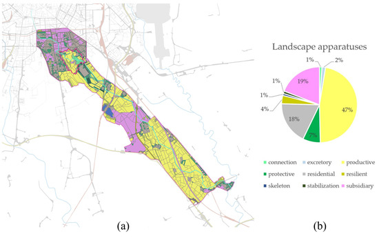 The extra-local-scale landscape apparatuses analysis (Figure 3) highlighted the predominance of the productive agricultural apparatus (47%); subsidiary and residential apparatuses follow (respectively, 19% and 18%), while protective (7%), resilient (4%), connection (1%) and stabilization (1%) apparatuses are strongly under-represented. This current physiological configuration of the landscape system underlines a highly compromised balance for what concerns the landscape system metabolism. This entails direct and indirect consequences on the environmental stability parameters of the existing agroecosystems, which might face stronger vulnerabilities due to the lack of regulative functions of their peri-urban context [103,116].