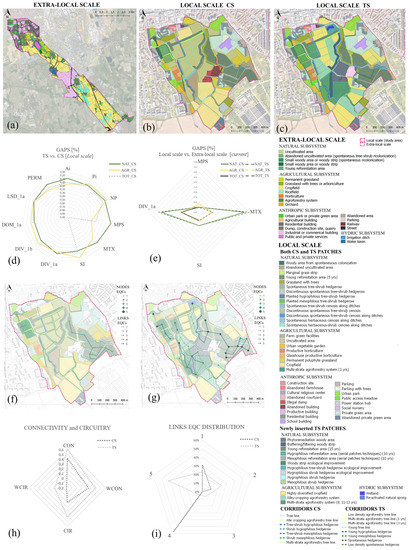 (a) Extra-local-scale eco-mosaic patches. (b,c) Local-scale CS and TS eco-mosaic patches. (d) Gaps between CS and TS landscape metric values on NAT, AGR and TOT sub-systems. In detail: patches metrics (Ai: area; Pi: perimeter; NP: number of patches; MPS: medium patch size; MTX: matrix); physiognomic–structural indices (SI: shape index; DIV_1a-DIV_1b: landscape diversity indices; DOM_1a: landscape dominance index; LSD_1a: landscape structural diversity index); structural–functional indices (PERM: permeable surface; BTCi: land-use-type-specific biological territorial capacity (mean value); BTC_ha: areal biological territorial capacity). (e) Gaps between local-scale (separately, CS and TS) versus extra-local-scale landscape metric values on NAT, AGR and TOT sub-systems (MPS, MTX, SI, DIV_1a indices). (f,g) Local scale CS and TS connectivity components (links and nodes) belonging to different Ecological Quality Classes (EQCs = [1–5]). (h) CS and TS connectivity and circuitry values. In detail: CON: connectivity index; WCON: weighted connectivity index; CIR: circuitry index; WCIR: weighted circuitry index. (i) CS and TS links EQCs distribution (%).