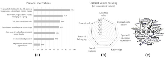 To better assess the complexity of CESs, a multiple-choice question detected the type of personal and perceptive spontaneous interactions with the AF project. The following actions are performed: walk between the lines (84.4%); observe the landscape (75%); observe the fauna (50%); sit or lie down and close their eyes (37.5%); listen to what is happening around them (59.4%); smell the aromas emanating from the AF project (56.3%); put their hands in the earth in search of a lost contact (37.5%); and touch the plants (68.8%). Several respondents enter a spiritual, exploratory and self-awareness dimension through prayer (9.4%), meditation (25%), reading (12.5%), drawing (3.1%), writing (6.3%), photography (37.5%) and video filming (15.6%), as well as sharing these experiences on social networks (12.5%) or through conversations with neighbouring inhabitants (15.6%). The word cloud summarises the words best representing the respondents’ states of mind related to AF experiences (Figure 5c). All this information helped in linking the volunteers’ interactions with AF to CESs, referring to nonmonetary methods [144]. Nevertheless, a question was included attempting to probe the volunteers’ perceptions of CES economic issues. Answers confirmed, on one hand, the difficulty in placing a value in monetary terms; on the other hand, the belief that the CESs generated for free by agroforestry are sufficiently “paid back” (75% are unable to quantify the economic value of such services and believe that more financial resources, both public and private, should be allocated to AF management; 9.4% would be willing to invest personal economic resources on the AF care and management activities).